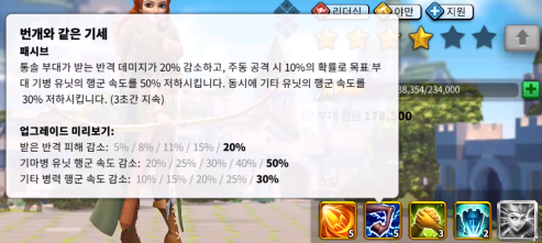 반격데미지20% 감소와 주동공격시 10%확률로 3초간 행군속도를 기병유닛은 50%, 그외는 30%를 저하시킵니다