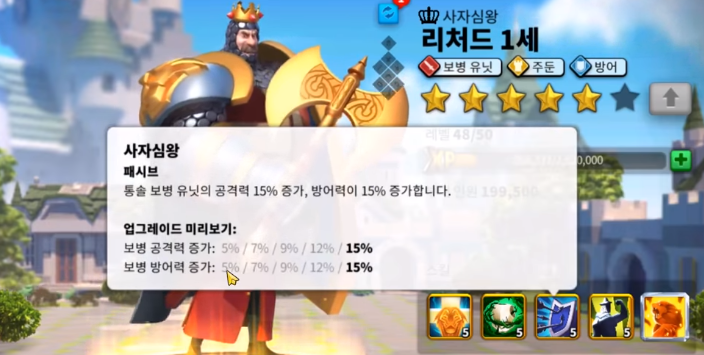 각성스킬까지 가게되면 패시브로 부대가 받는피해 5%감소, 보병유닛이 기마병 유닛에게 주는피해 2%증가, 10초마다 5총동안 타깃의 행군속도 50%감소효과를 가지고있어 리처드에게 잘못잡히면 도망도 못가고 개죽음 당할 수 있습니다.