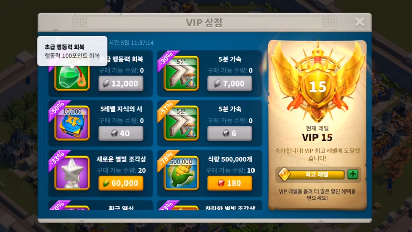 VIP 7 - VIP상점에서 8시간 가속 구매 가능