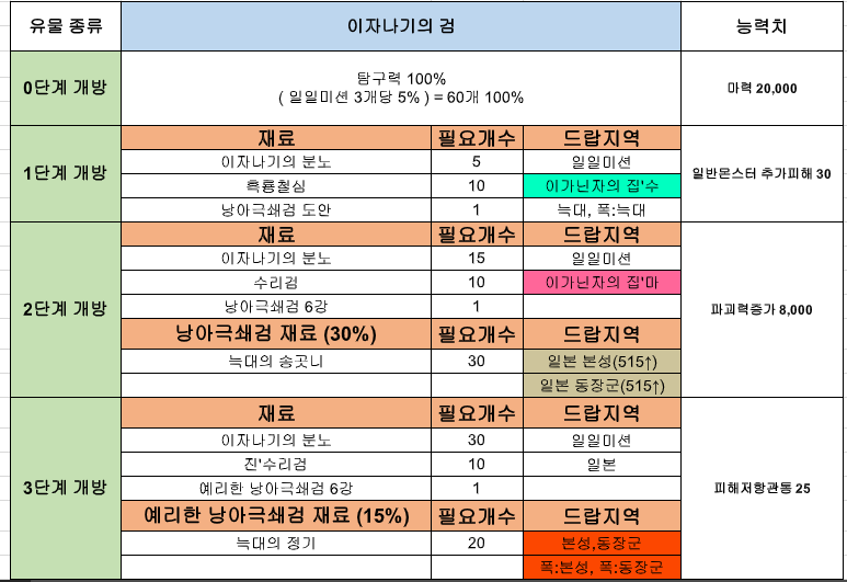 유물 업그레이드 필요한 총 재료 및 드랍장소